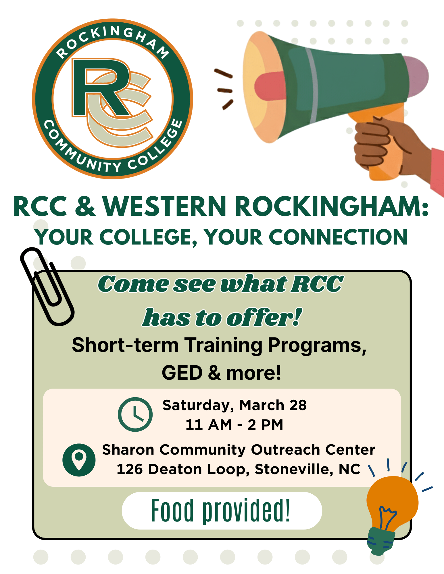 The Sharon Community Outreach Corporation (SCOC) is 501(c)(3) non-profit organization in Stoneville, North Carolina. In partnership with the Sharon Missionary Baptist Church, the SCOC opened the Sharon Community Outreach Center to the Rockingham County community in September 2023. The center offers local organizations a convening space with a commercial kitchen, gymnasium, and conference room equipped with audio-visual equipment for hybrid meetings. The SCOC is a hub center in partnership with the Duke Endowment to host health clinics to increase the accessibility and availability of healthcare in Western Rockingham County.